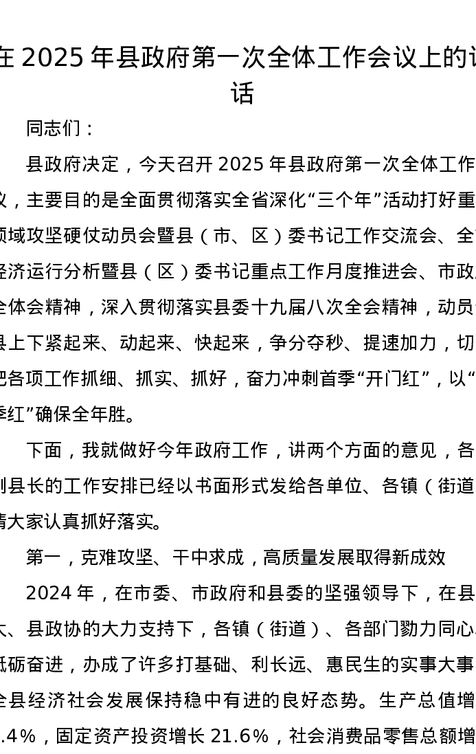 县委副书记、县长在2025年县政府第一次全体工作会议上的讲话