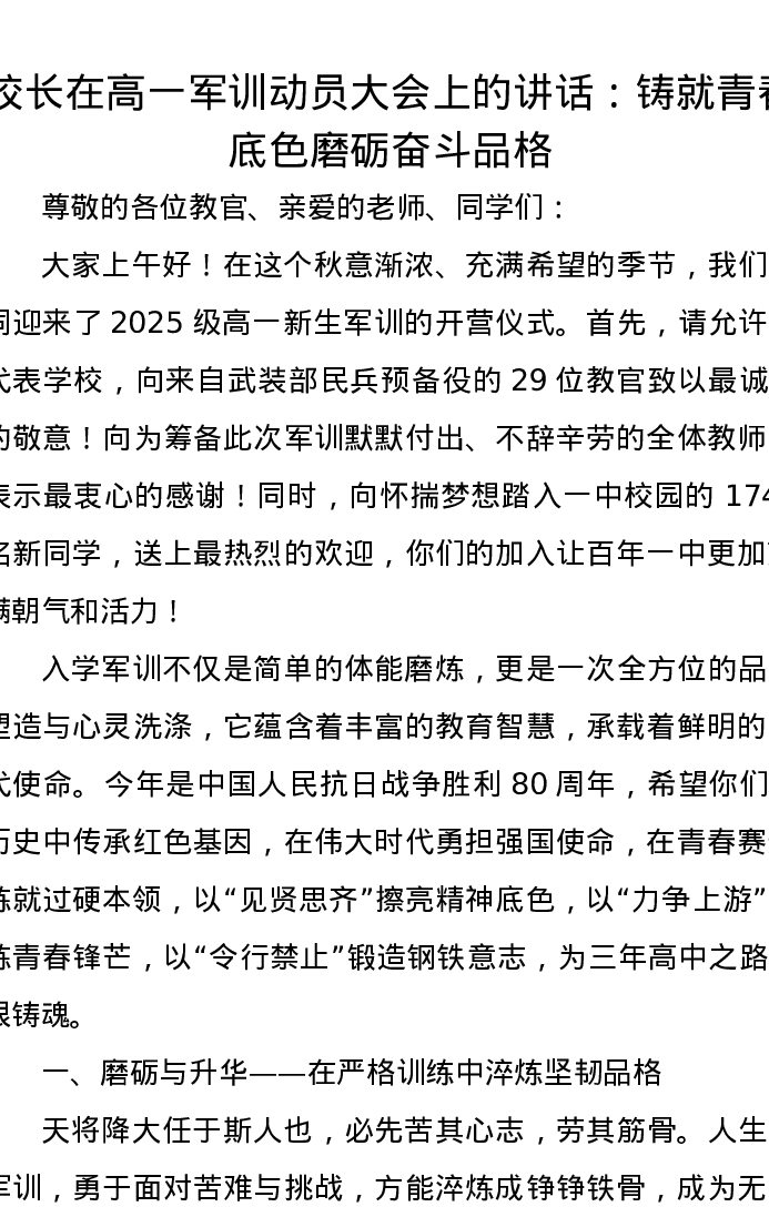 校长在高一军训动员大会上的讲话:铸就青春底色 磨砺奋斗品格