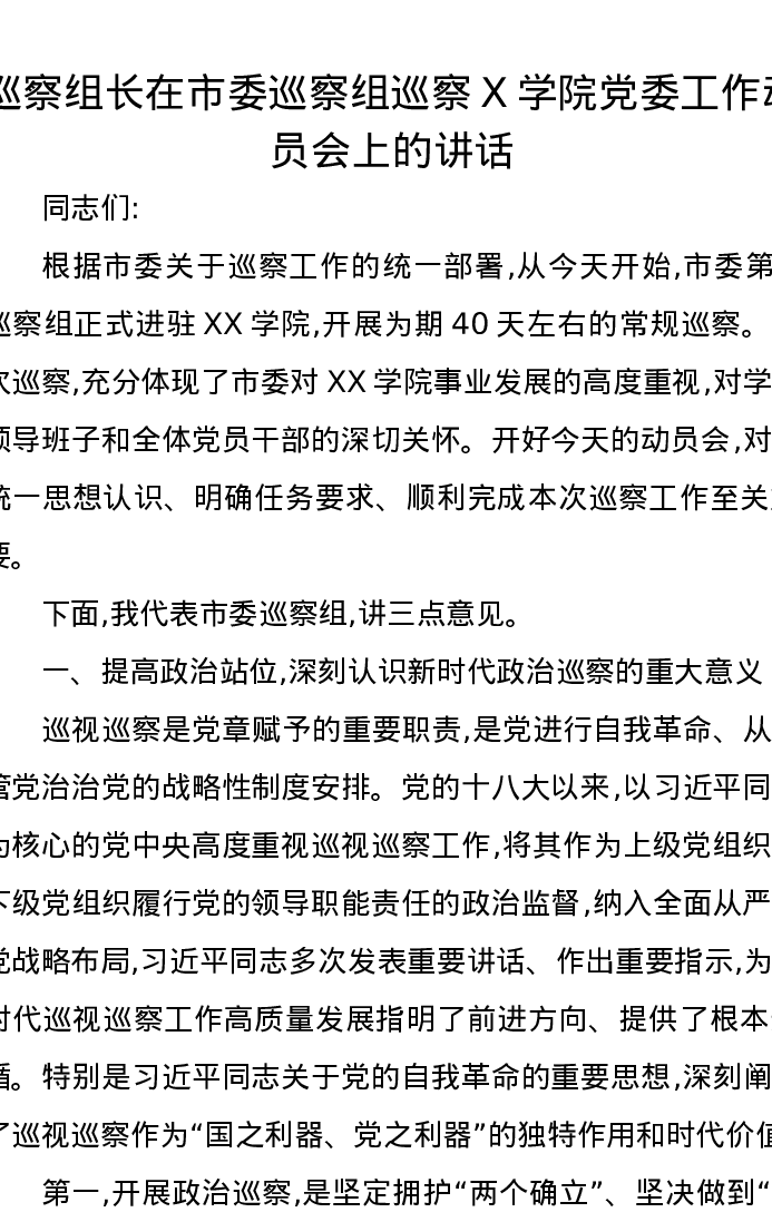 巡察组长在市委巡察组巡察X学院党委工作动员会上的讲话