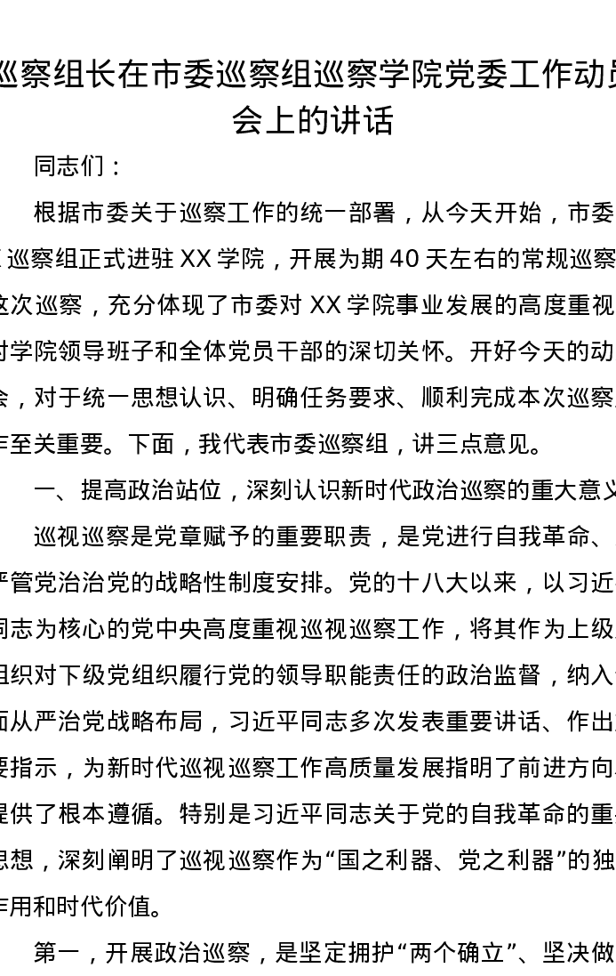 巡察组长在市委巡察组巡察学院党委工作动员会上的讲话