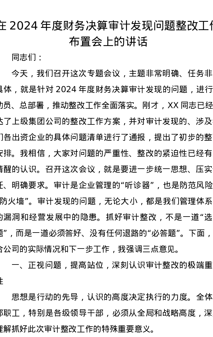 在2024年度财务决算审计发现问题整改工作布置会上的讲话