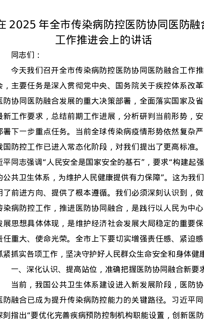 在2025年全市传染病防控医防协同医防融合工作推进会上的讲话