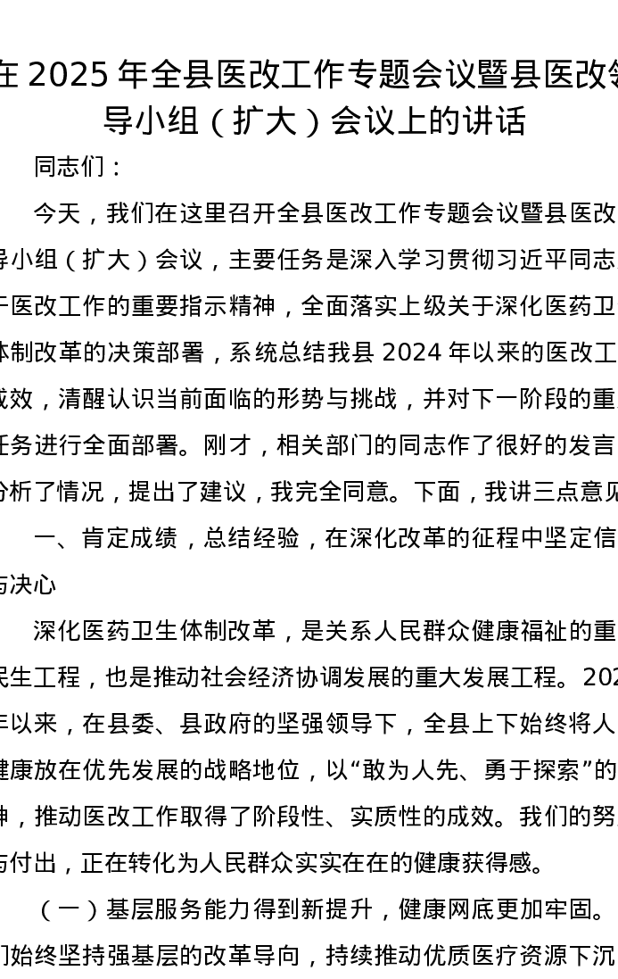 在2025年全县医改工作专题会议暨县医改领导小组(扩大)会议上的讲话