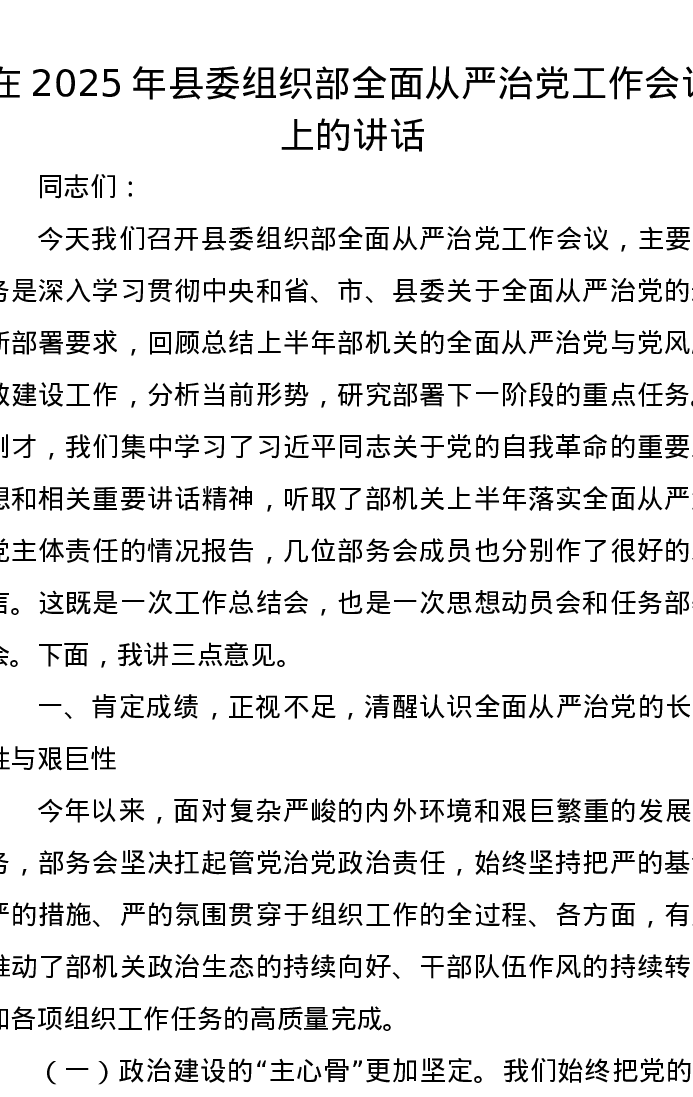 在2025年县委组织部全面从严治党工作会议上的讲话