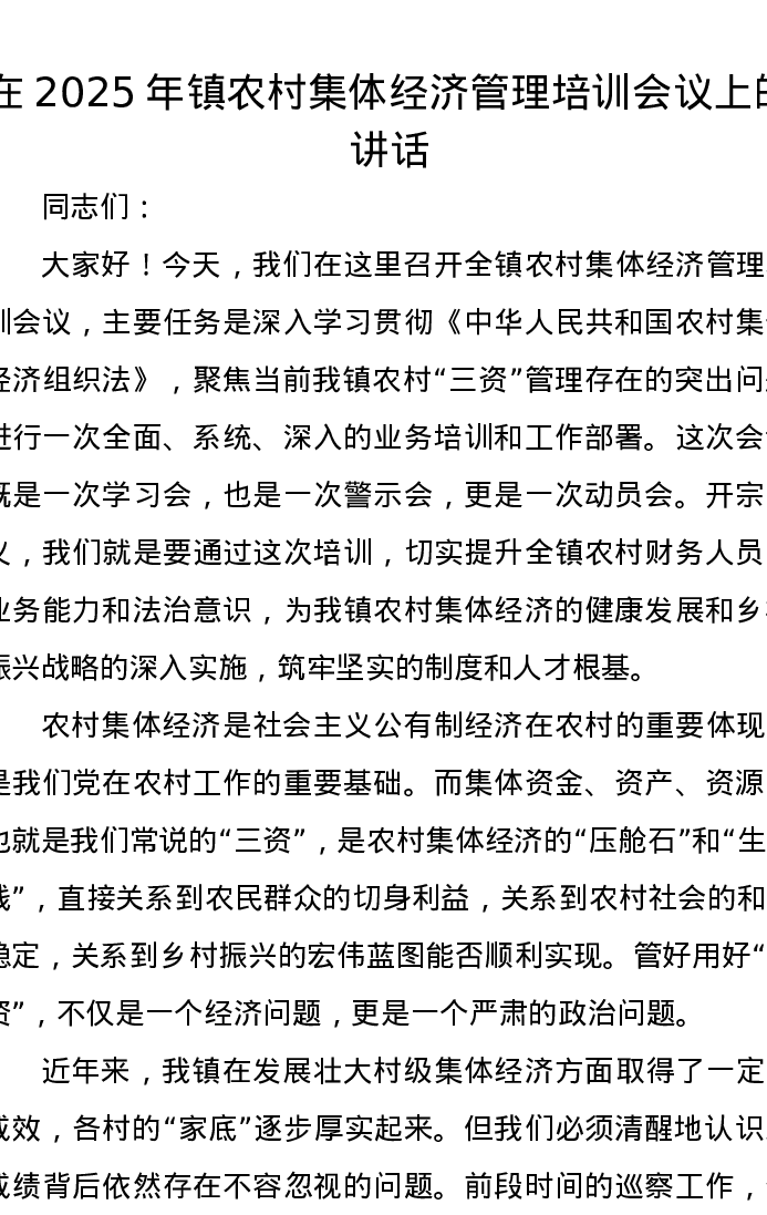 在2025年镇农村集体经济管理培训会议上的讲话