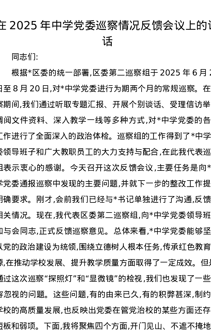 在2025年中学党委巡察情况反馈会议上的讲话