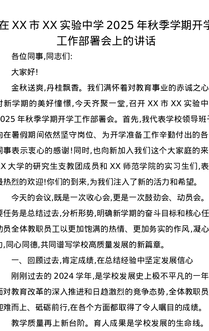 在XX市XX实验中学2025年秋季学期开学工作部署会上的讲话