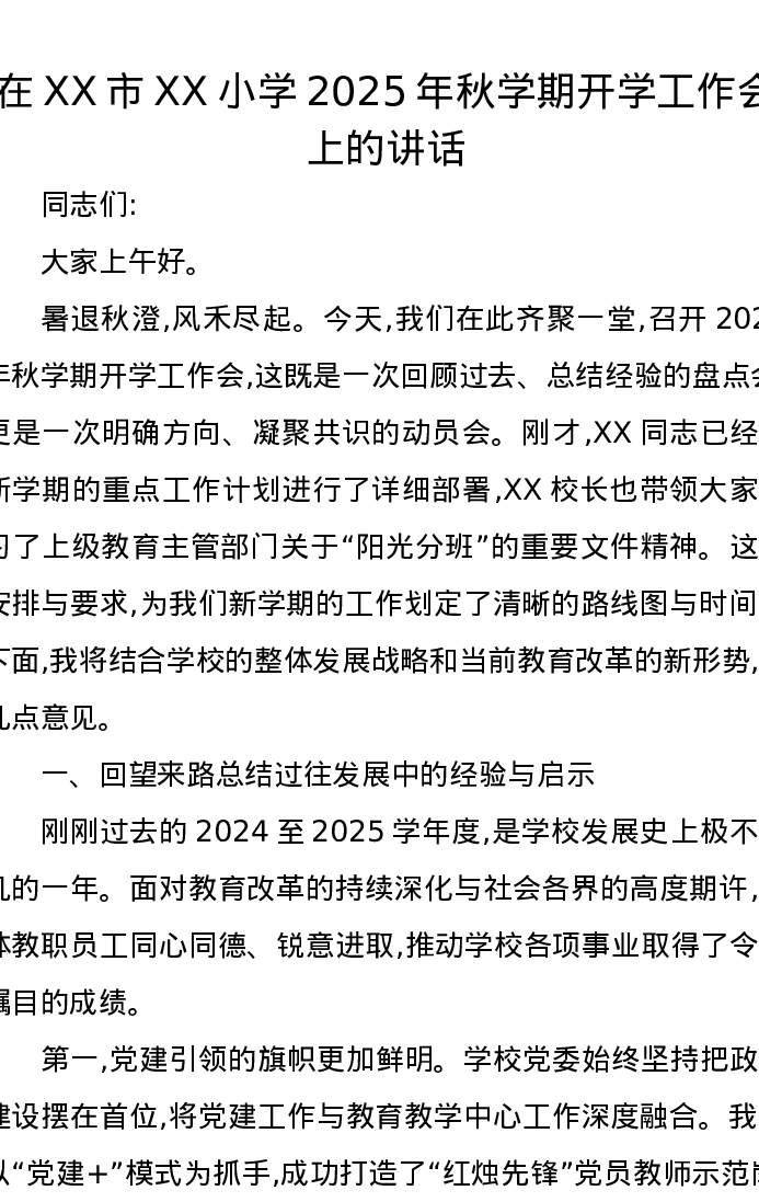 在XX市XX小学2025年秋学期开学工作会上的讲话