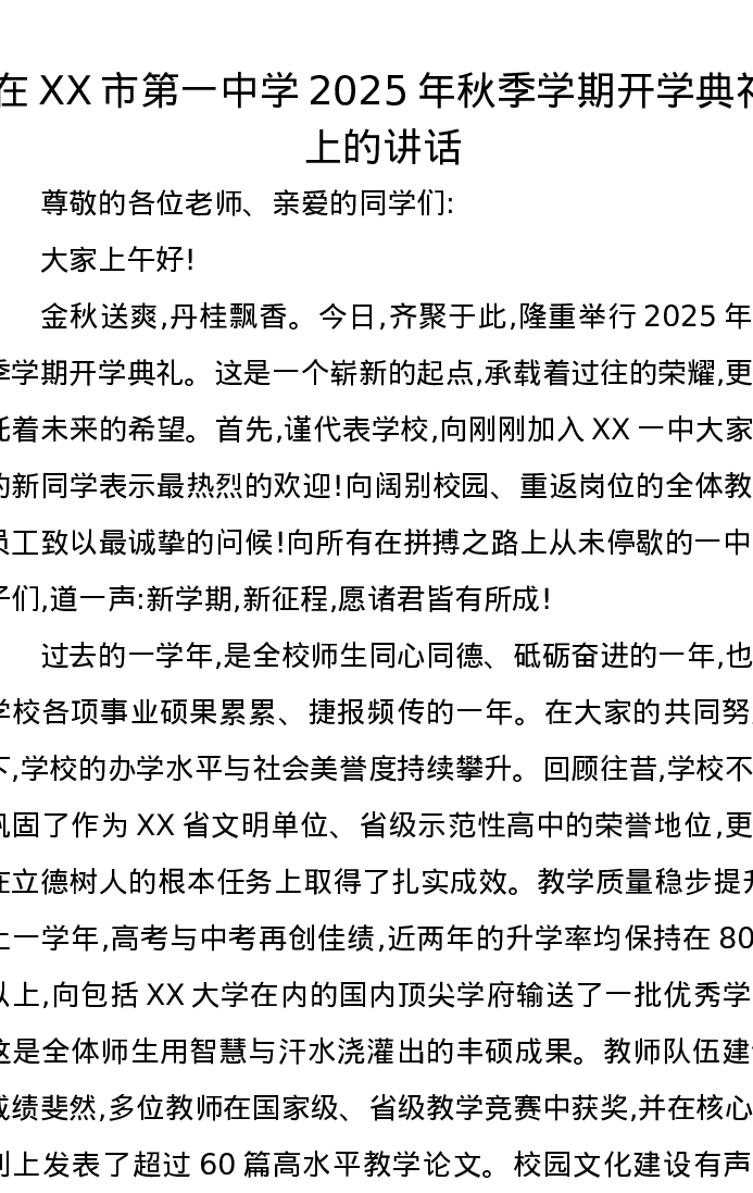 在XX市第一中学2025年秋季学期开学典礼上的讲话