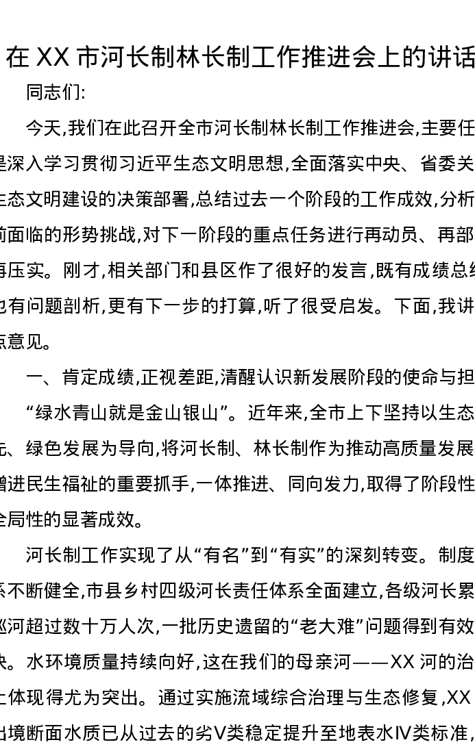 在XX市河长制林长制工作推进会上的讲话