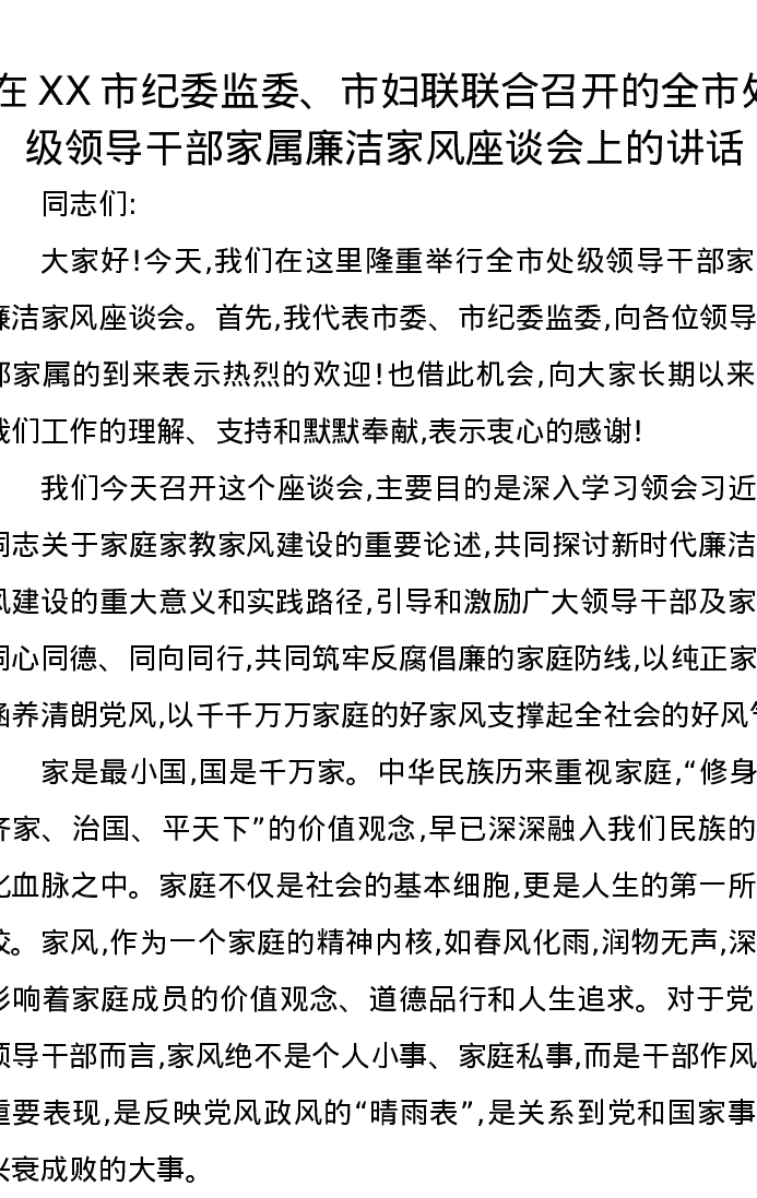 在XX市纪委监委、市妇联联合召开的全市处级领导干部家属廉洁家风座谈会上的讲话