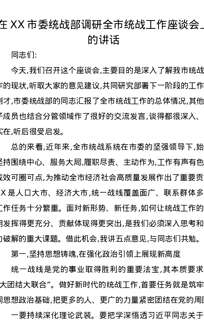 在XX市委统战部调研全市统战工作座谈会上的讲话