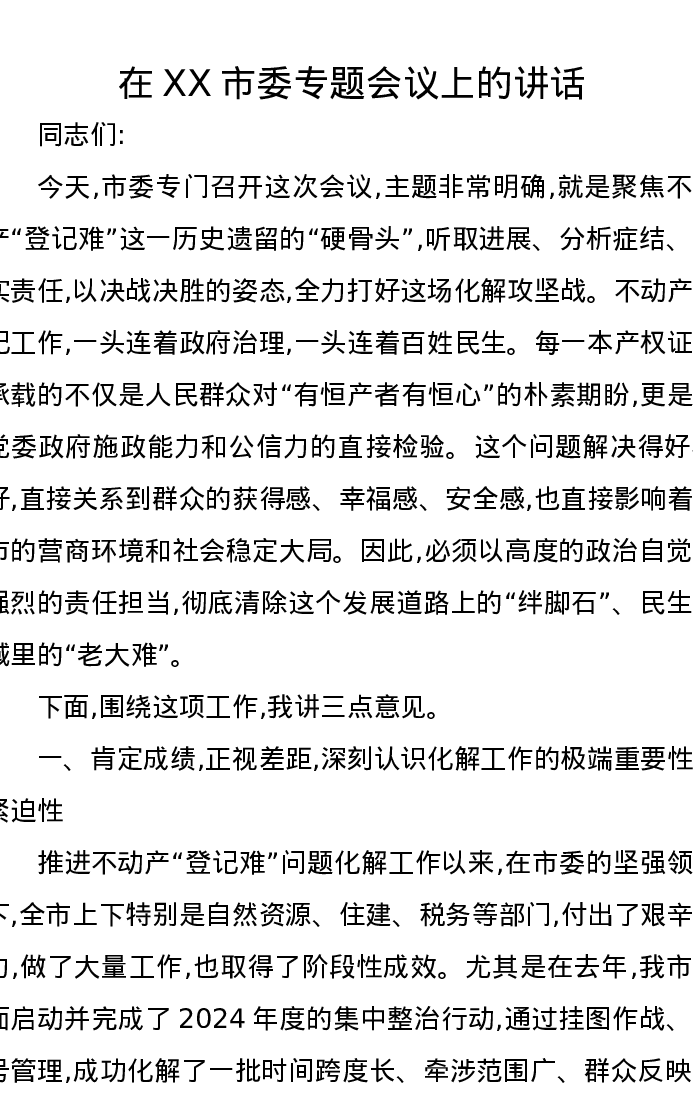 在XX市委专题会议上的讲话