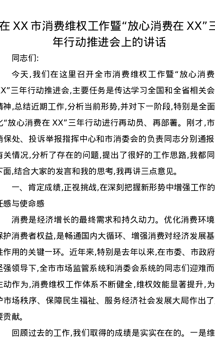 在XX市消费维权工作暨“放心消费在XX”三年行动推进会上的讲话