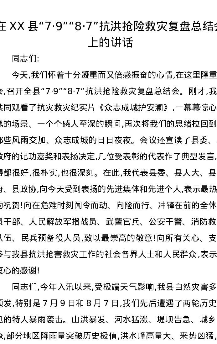在XX县“7·9”“8·7”抗洪抢险救灾复盘总结会上的讲话