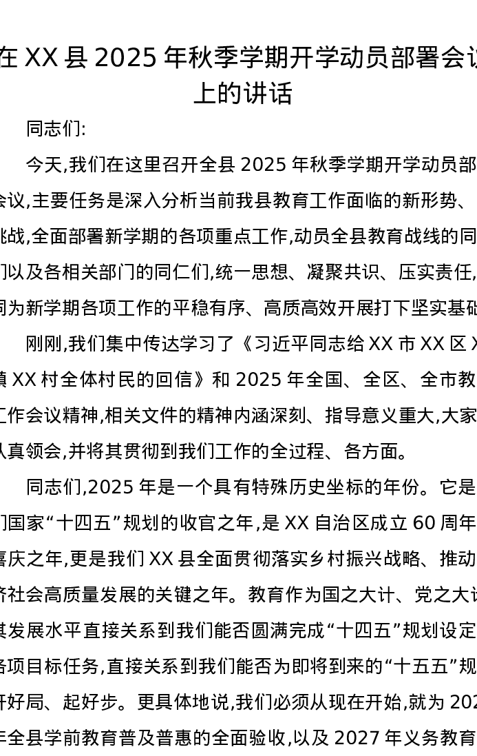 在XX县2025年秋季学期开学动员部署会议上的讲话