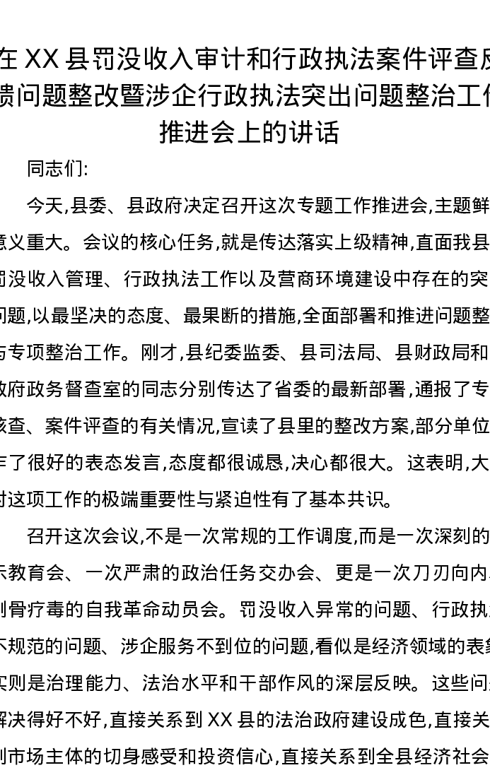 在XX县罚没收入审计和行政执法案件评查反馈问题整改暨涉企行政执法突出问题整治工作推进会上的讲话