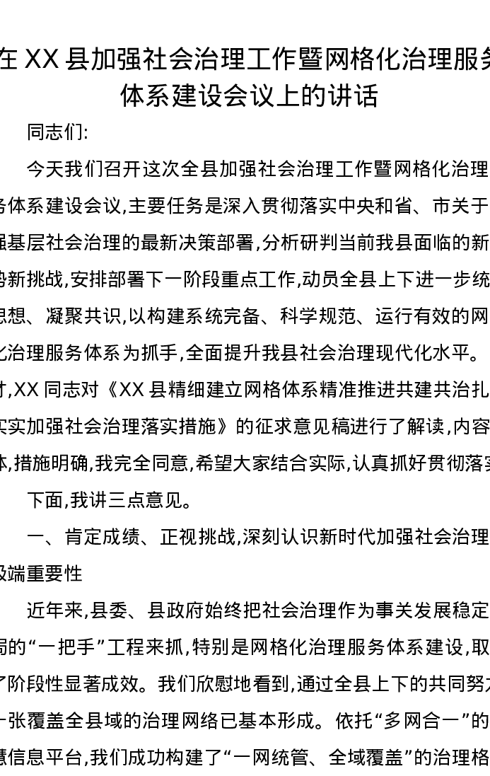 在XX县加强社会治理工作暨网格化治理服务体系建设会议上的讲话