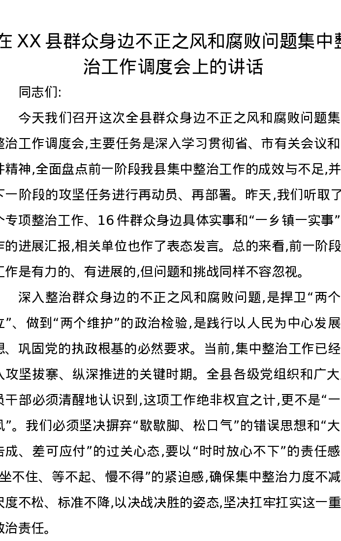 在XX县群众身边不正之风和腐败问题集中整治工作调度会上的讲话