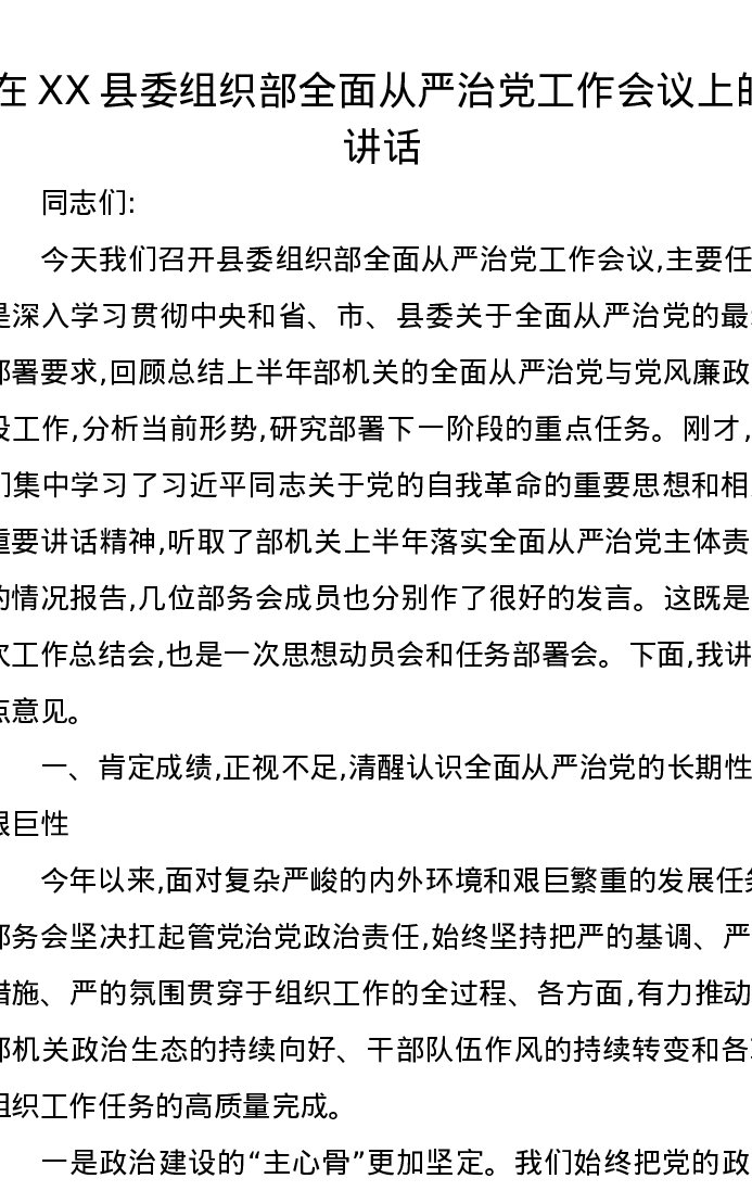 在XX县委组织部全面从严治党工作会议上的讲话
