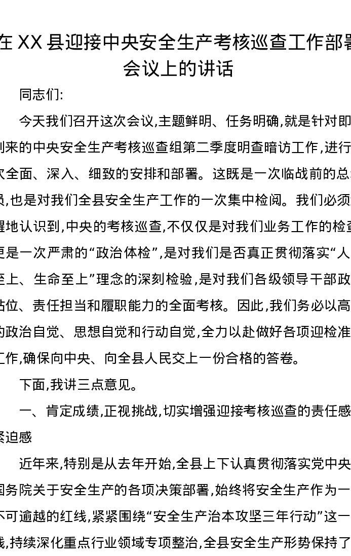 在XX县迎接中央安全生产考核巡查工作部署会议上的讲话