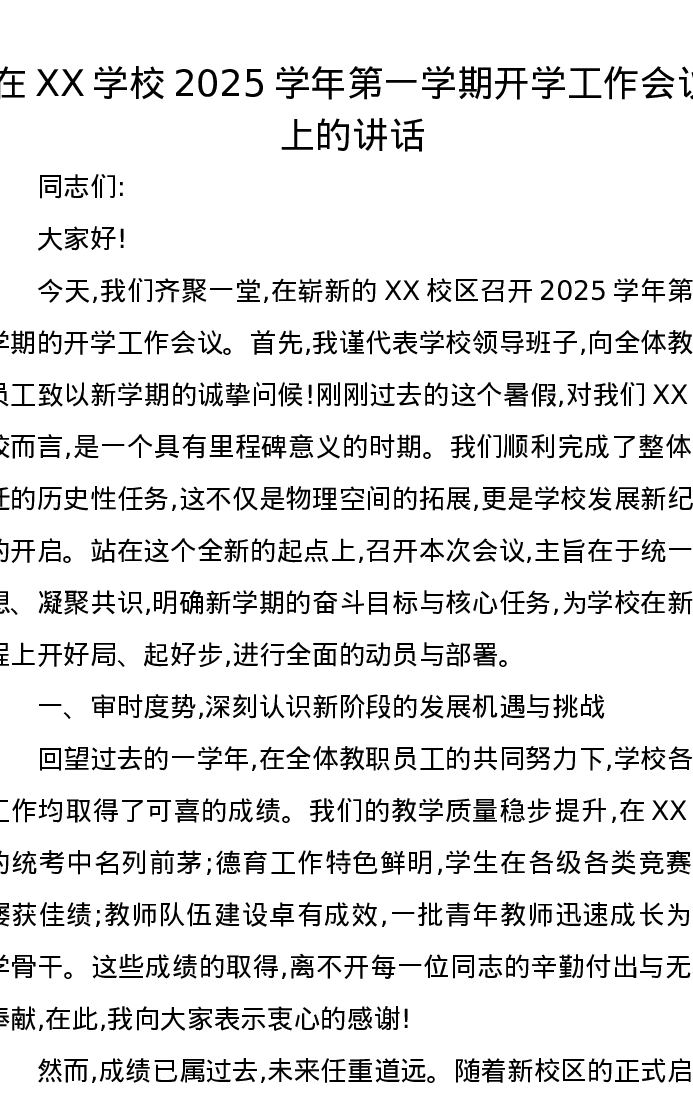 在XX学校2025学年第一学期开学工作会议上的讲话