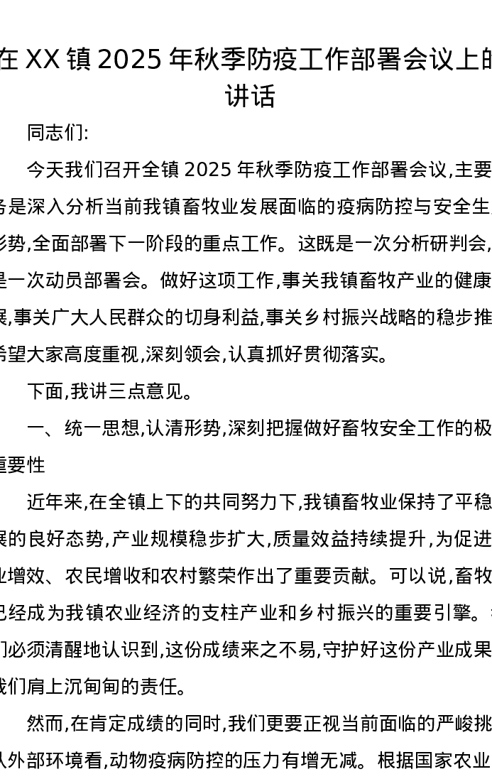 在XX镇2025年秋季防疫工作部署会议上的讲话