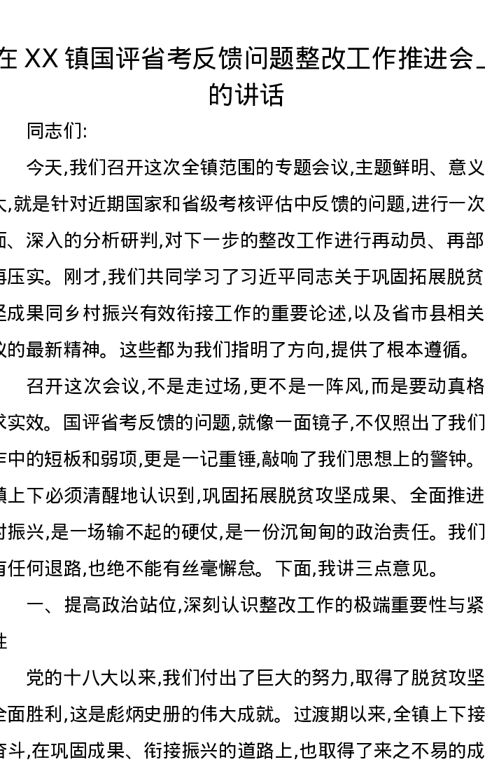 在XX镇国评省考反馈问题整改工作推进会上的讲话