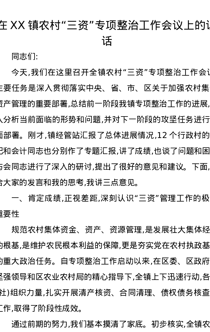 在XX镇农村“三资”专项整治工作会议上的讲话