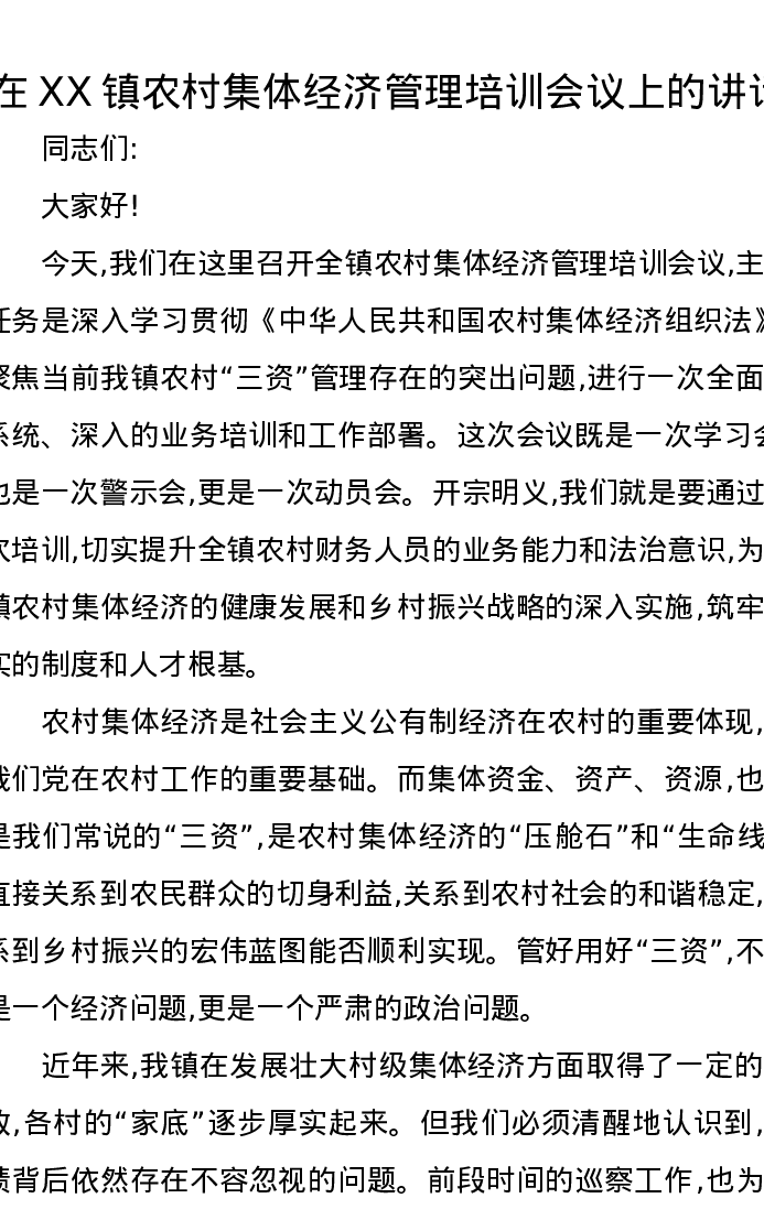 在XX镇农村集体经济管理培训会议上的讲话