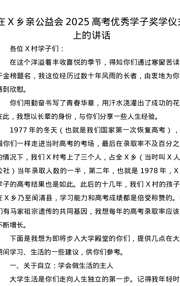 在X乡亲公益会2025高考优秀学子奖学仪式上的讲话