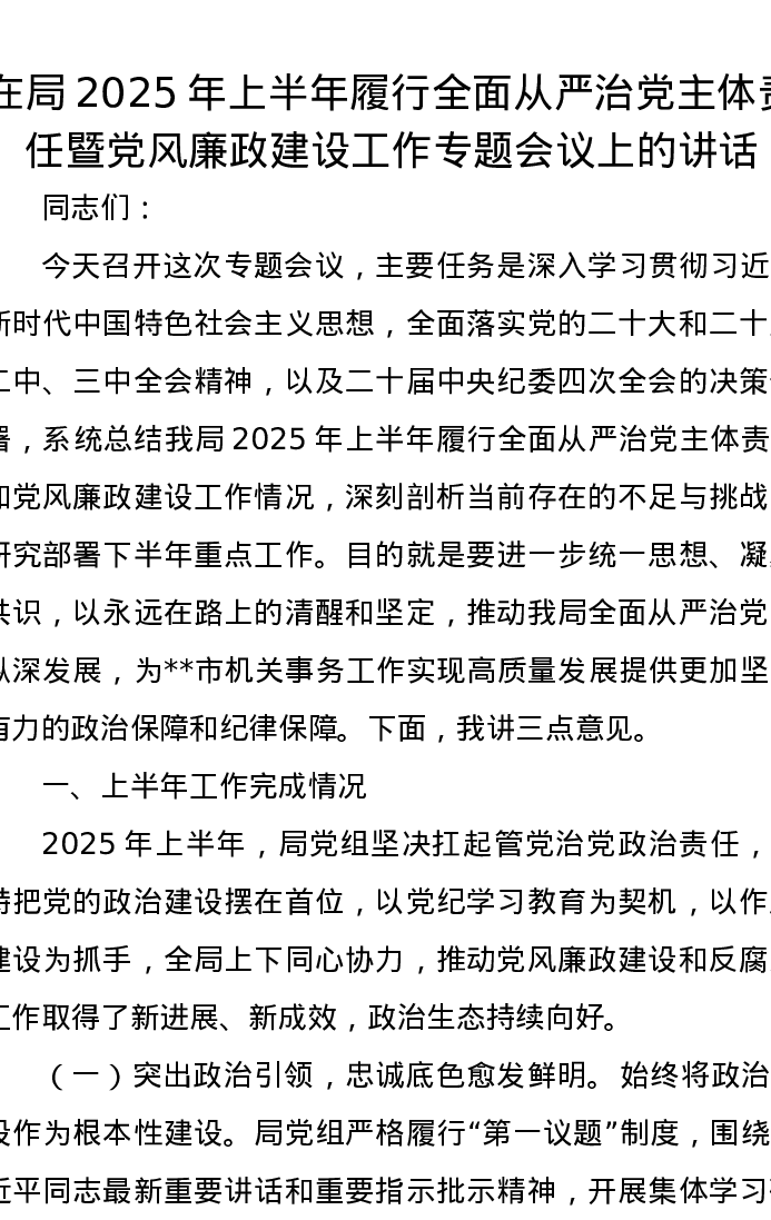 在局2025年上半年履行全面从严治党主体责任暨党风廉政建设工作专题会议上的讲话