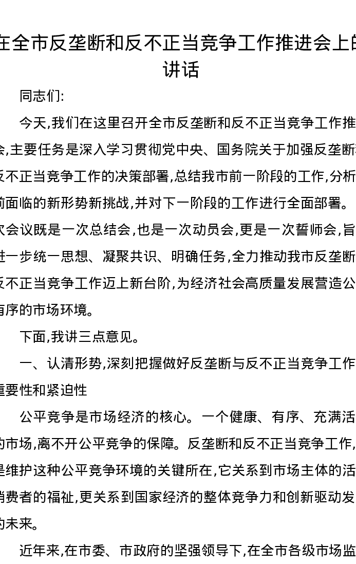 在全市反垄断和反不正当竞争工作推进会上的讲话