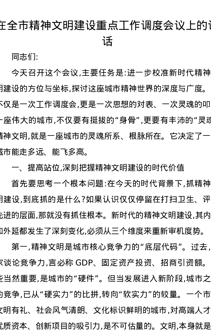 在全市精神文明建设重点工作调度会议上的讲话