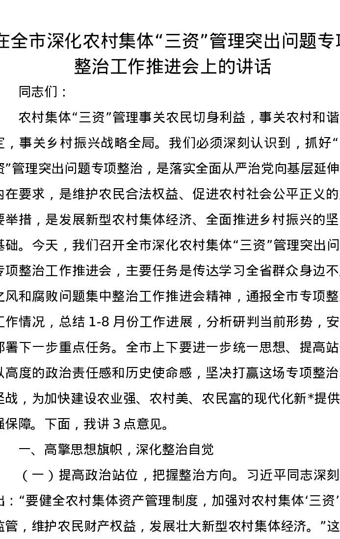 在全市深化农村集体“三资”管理突出问题专项整治工作推进会上的讲话