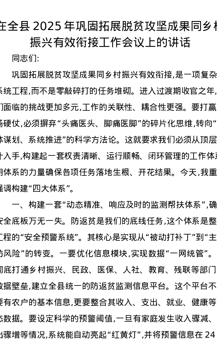 在全县2025年巩固拓展脱贫攻坚成果同乡村振兴有效衔接工作会议上的讲话