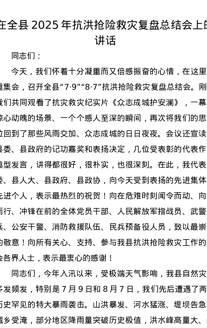 在全县2025年抗洪抢险救灾复盘总结会上的讲话