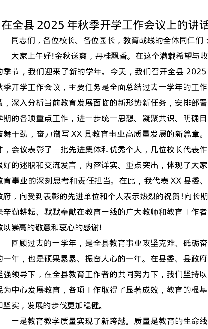 在全县2025年秋季开学工作会议上的讲话