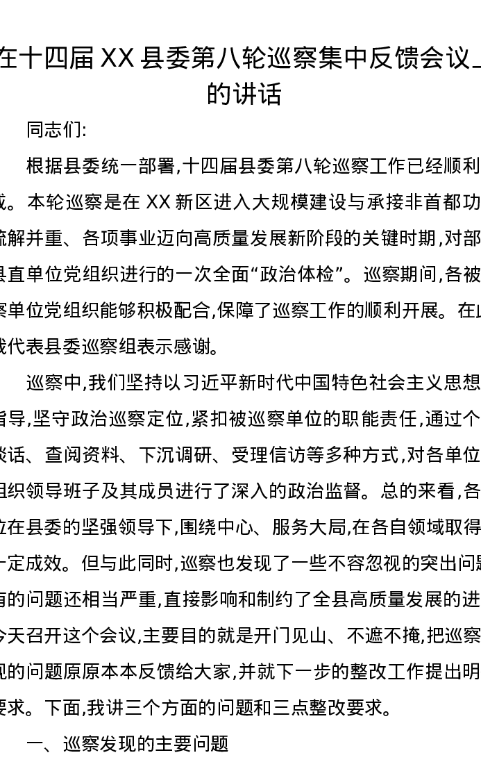 在十四届XX县委第八轮巡察集中反馈会议上的讲话