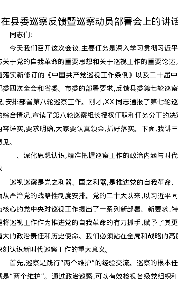 在县委巡察反馈暨巡察动员部署会上的讲话