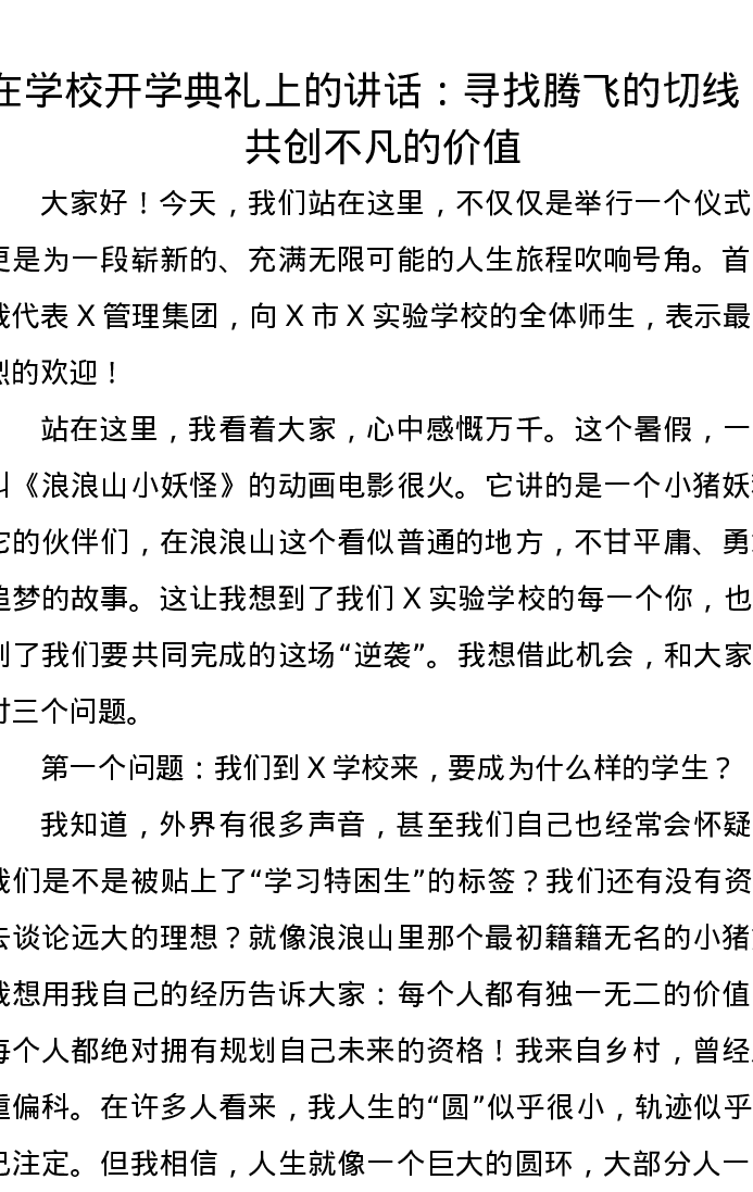 在学校开学典礼上的讲话:寻找腾飞的切线,共创不凡的价值
