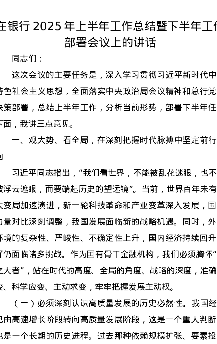 在银行2025年上半年工作总结暨下半年工作部署会议上的讲话