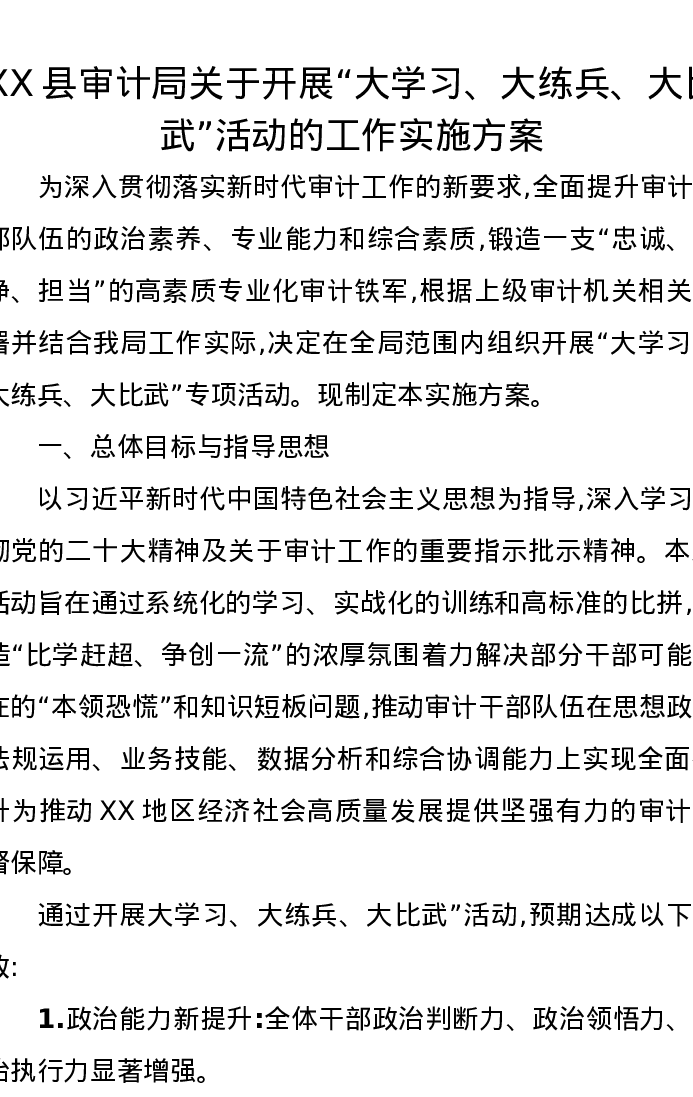 XX县审计局关于开展“大学习、大练兵、大比武”活动的工作实施方案