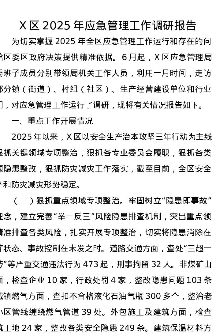 X区2025年应急管理工作调研报告