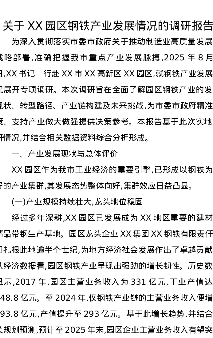 关于XX园区钢铁产业发展情况的调研报告