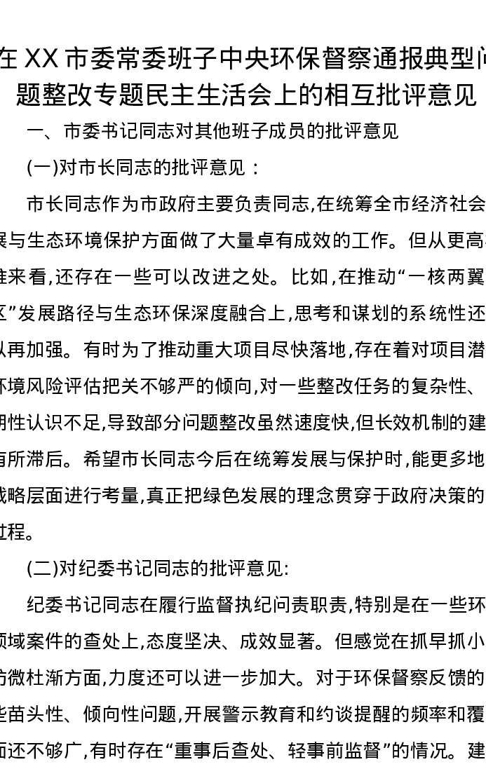 在XX市委常委班子中央环保督察通报典型问题整改专题民主生活会上的相互批评意见