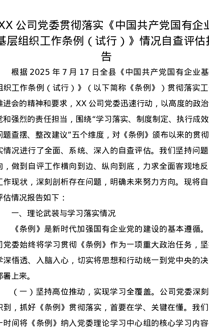 XX公司党委贯彻落实《中国共产党国有企业基层组织工作条例(试行)》情况自查评估报告