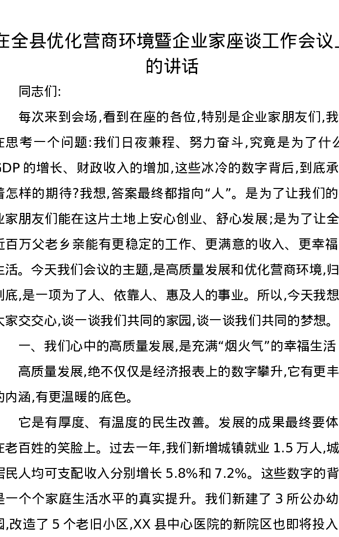 在全县优化营商环境暨企业家座谈工作会议上的讲话