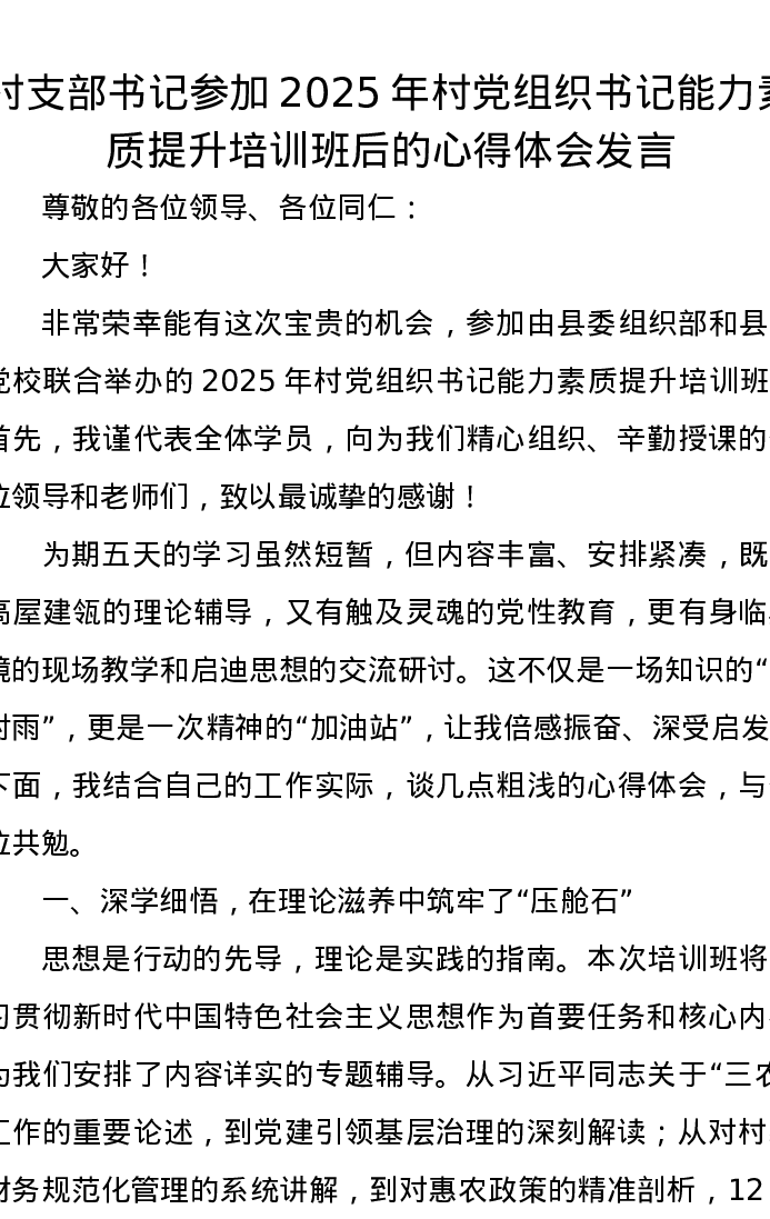 村支部书记参加2025年村党组织书记能力素质提升培训班后的心得体会发言