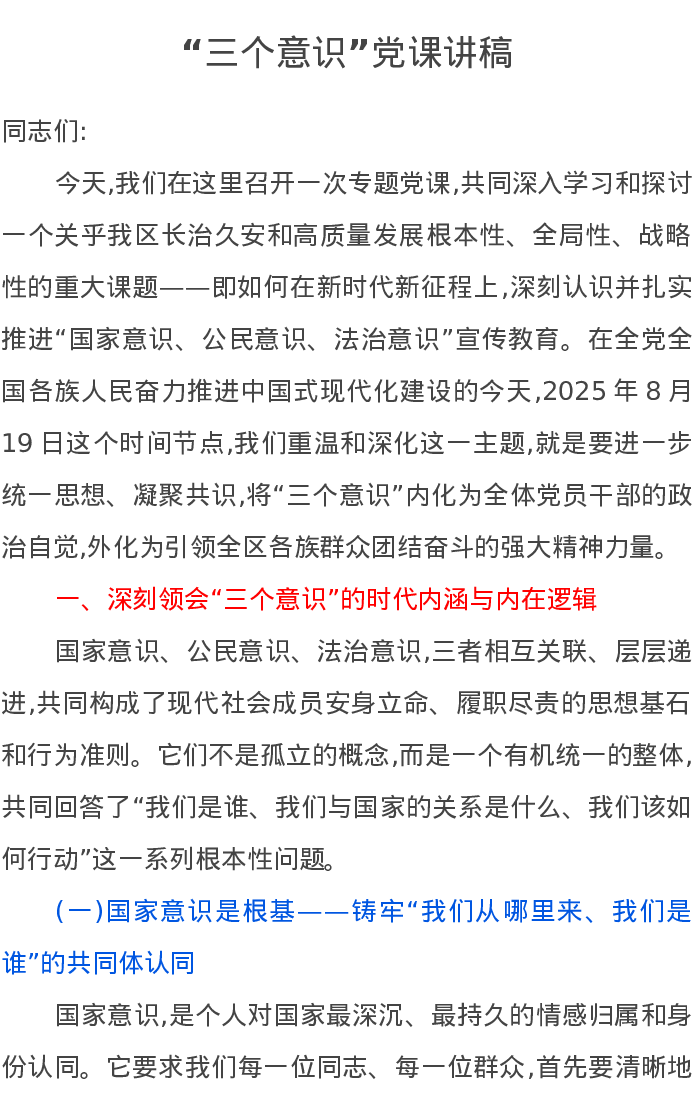 “三个意识”党课讲稿(国家意识、公民意识、法治意识)